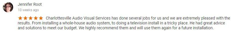 Charlottesville Audio Visual Services (434) 973-9269 is a privately-owned company dedicated to providing top-tier audiovisual sales, design, and installation services across central Virginia. We cater to residential, commercial, retail, church, facility, and restaurant projects, specializing in delivering cost-effective, user-friendly AV systems that bring smiles.