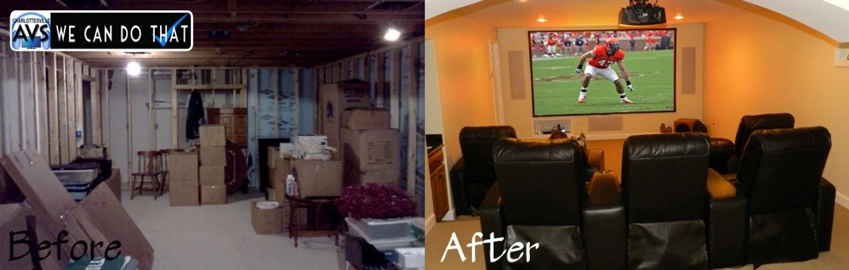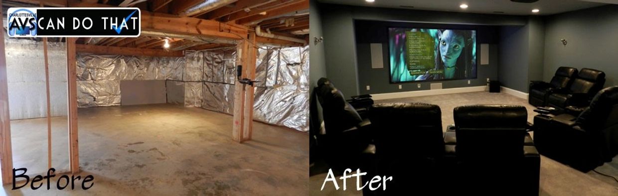 This basement was cramped and cluttered. AVS installed a very nice 5 seat (and 2 bean bags!) Theater into the space: Optoma projector. Draper screen. Harman Kardon Surround Amplifier, Butt Kickers (Vibrate the seats for extra boom feel) & Episode Speakers